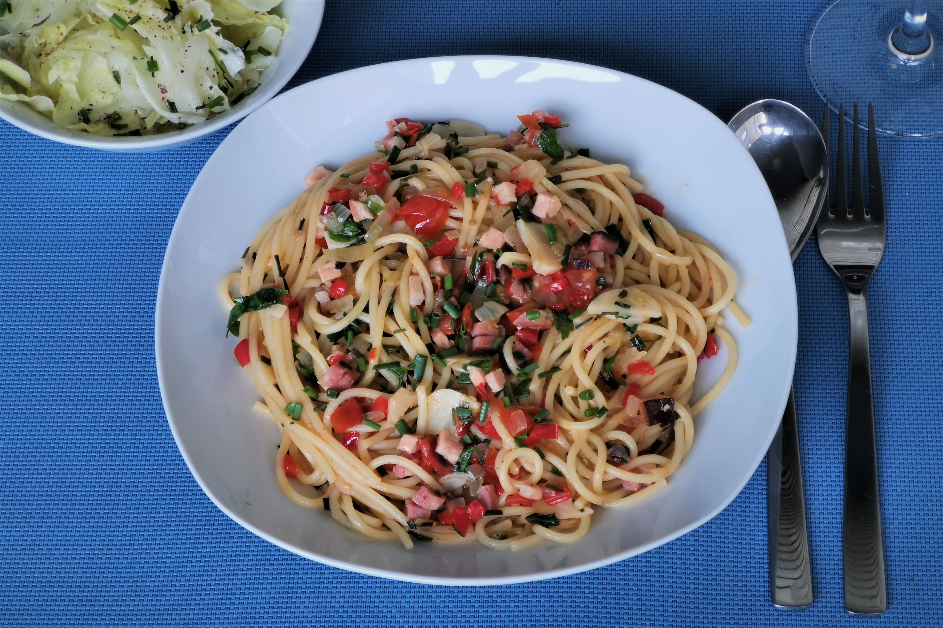 Gestern gab's eine Eigenkreation von Spaghetti, reichlich Knoblauch, Speck und mit einigen Rest'ln, die verwertet werden mussten sehr pikant gemacht und als Top feurig scharf mit Chilli angereichert. Die Italiener könnten dazu eventuell Spaghetti all' arrabbiata sagen ( :devil: ). Ua guat: