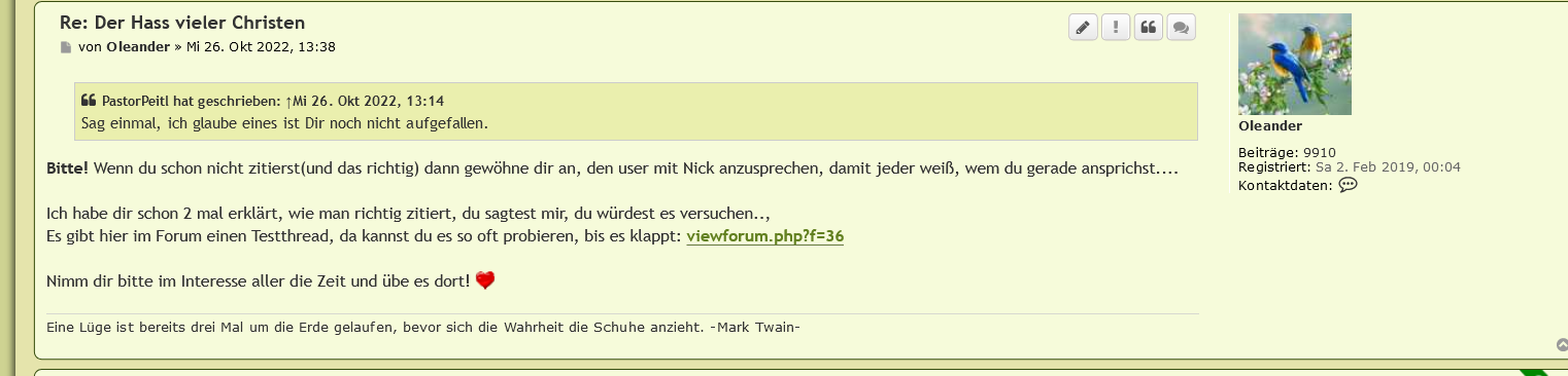 Ich zeige es dir ein letzes mal:PastorPeitl hat geschrieben: ↑Mi 26. Okt 2022, 13:40Ich markiere das immer und drücke auf die zitiert Funktion: Ausnahme ist dann, wenn ich davon ausgehe, dass der Satz so kurz ist, dass er automatisch direkt nach dem Post kommen müsste, dem ich antworte.Oleander hat geschrieben: ↑Mi 26. Okt 2022, 13:38 von Oleander » Mi 26. Okt 2022, 14:38