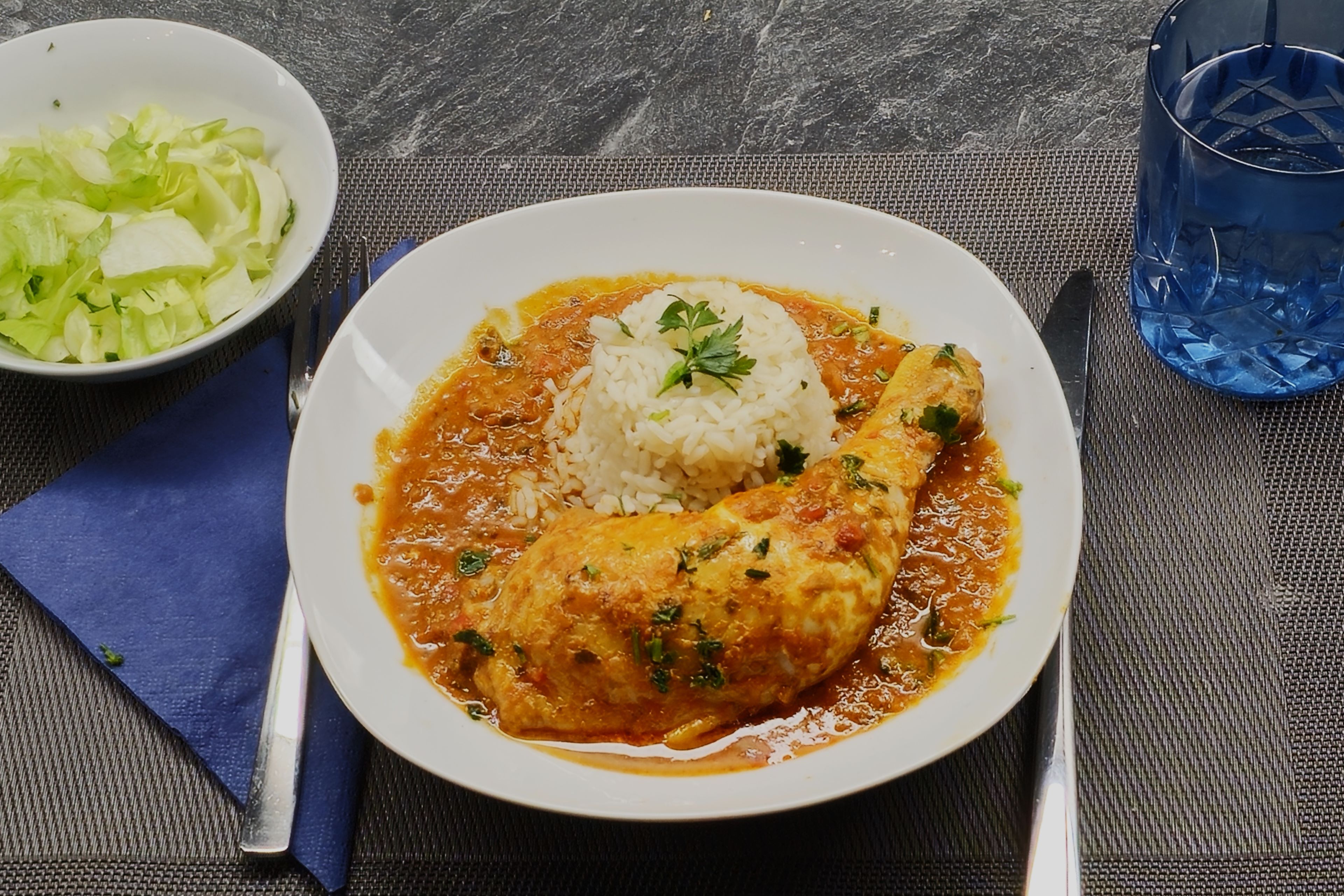 Zuletzt legst du die Hendlstücke ein, ganze Teile oder das Fleisch ausgelöst und geschnetzelt geschnitten und lässt es bei kleiner Hitze gemütlich dahinschmoren. Ab und zu umrühren. Sieh dabei zu, dass es immer ausreichend mit dem Saft abgedeckt ist. Während der Schmorzeit (ca. 40 Minuten) bereite ich die Beilagen zu. Gut dazu passt m.E. Reis, Bandnudeln oder Spätzle und bei mir immer auch Salat.