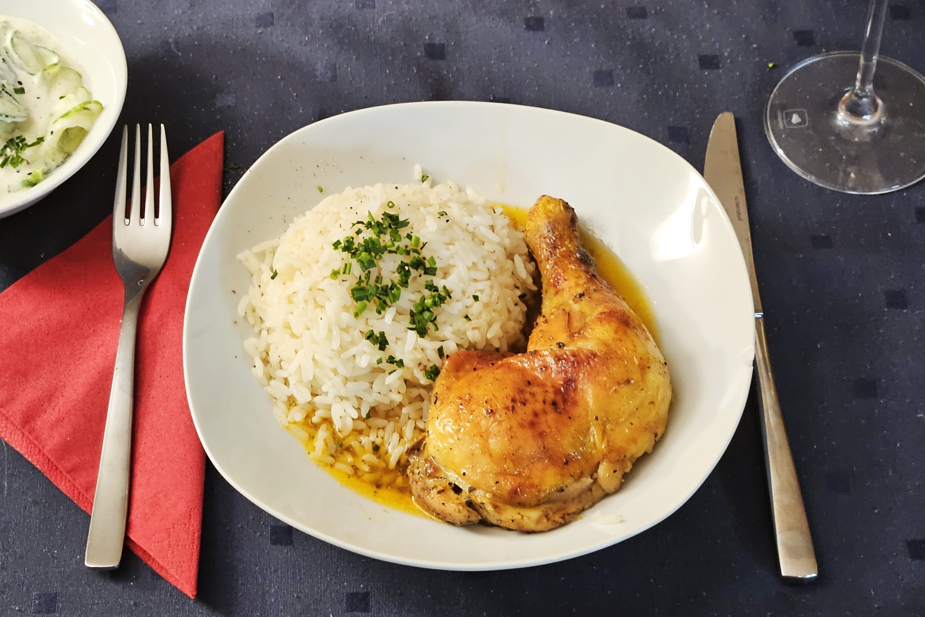 Einfach, aber für mich immer wieder herzhaft: Brathendl (Hendlhaxerl) mit Natursafterl und schlichter Reisbeilage:
