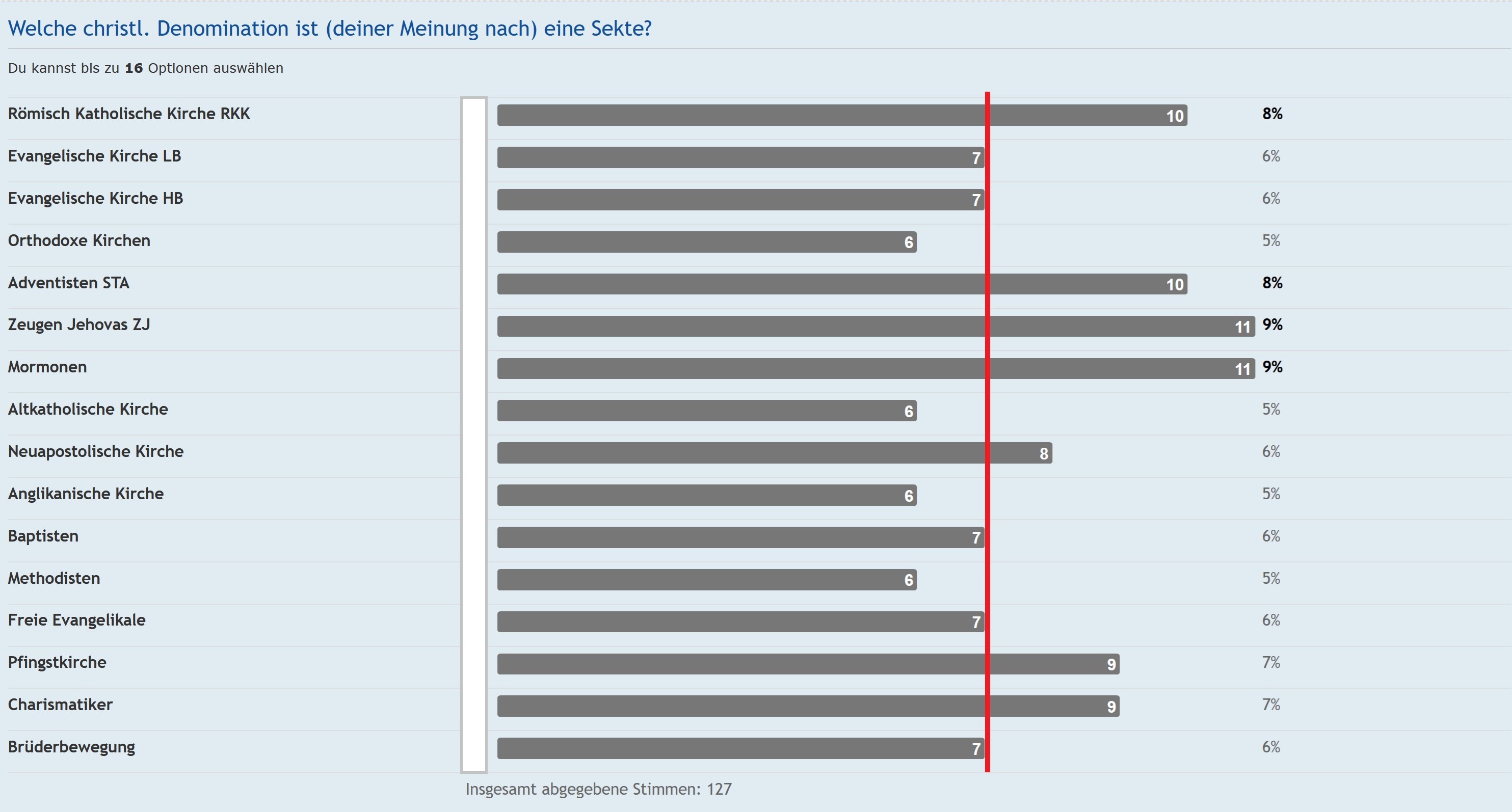 Es ändert am bisherigen Ergbnis nichts, es wurde der rote Balken lediglich von 6 auf 7 weiter geschoben. Der Stimmenzuwachs von 16 verteilt auf alle 16 gelisteten Denomonationen lässt den Schluss auf eine Person zu, die alle christltichen Denomination als Sekte bezeichnet. Das bestätigt an sich meine angewandte simple Filtertechnik und auch, dass diese Stimmen für die Gesamtbeurteilung irrelevant sind.