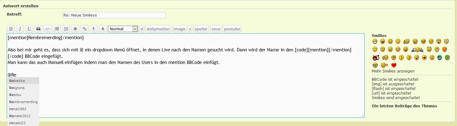 Man kann das auch Manuell einfügen indem man den Namen des Users in den mention BBCode einfügt.