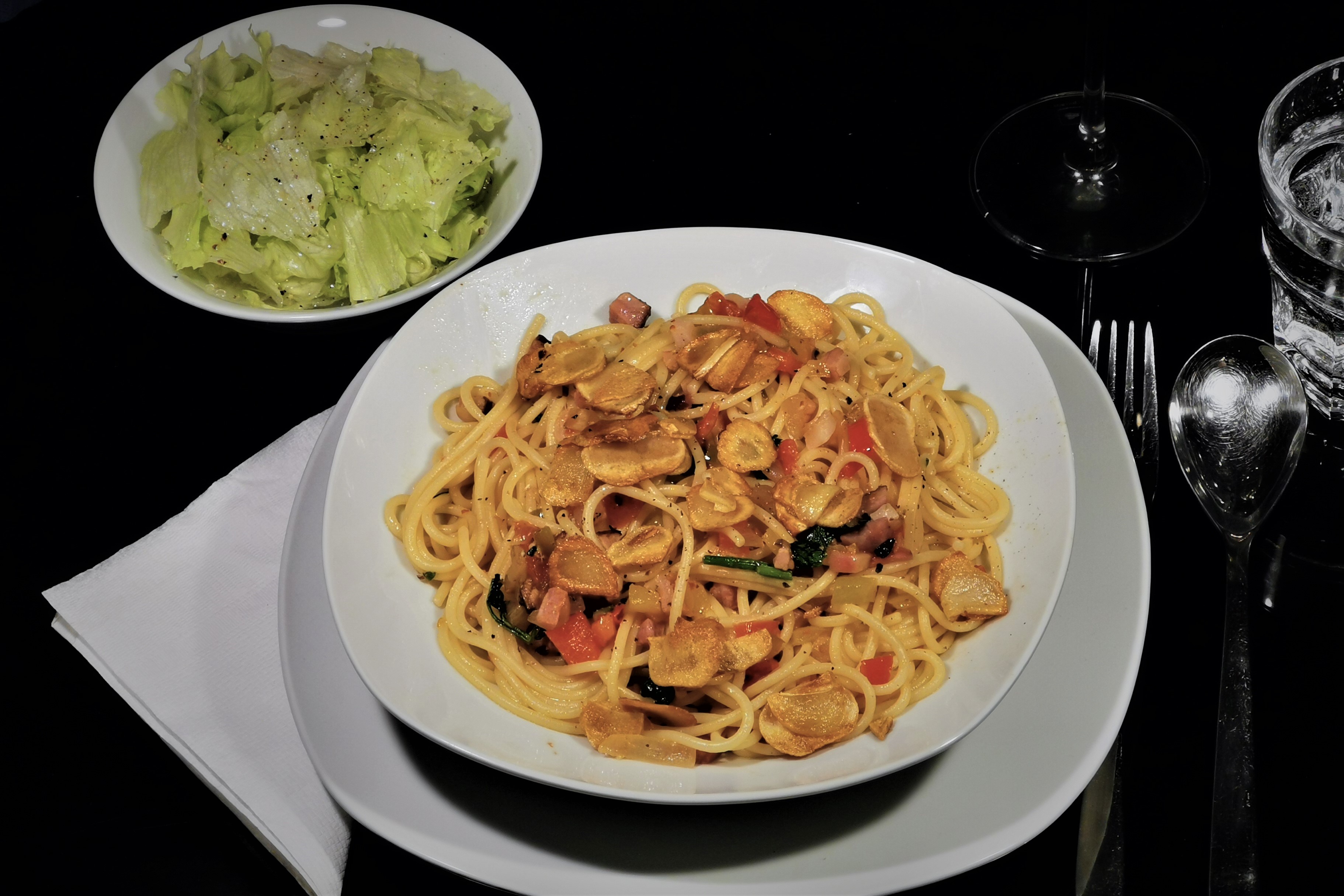 Heute eine Spaghetti Eigenkreation, die ich nun schon weiter verfeinert habe, bei mir feurig scharf mit Chilli und als Extra-Auflage mit knusprig angebratenen Knochblauchstreifen ergänzt: