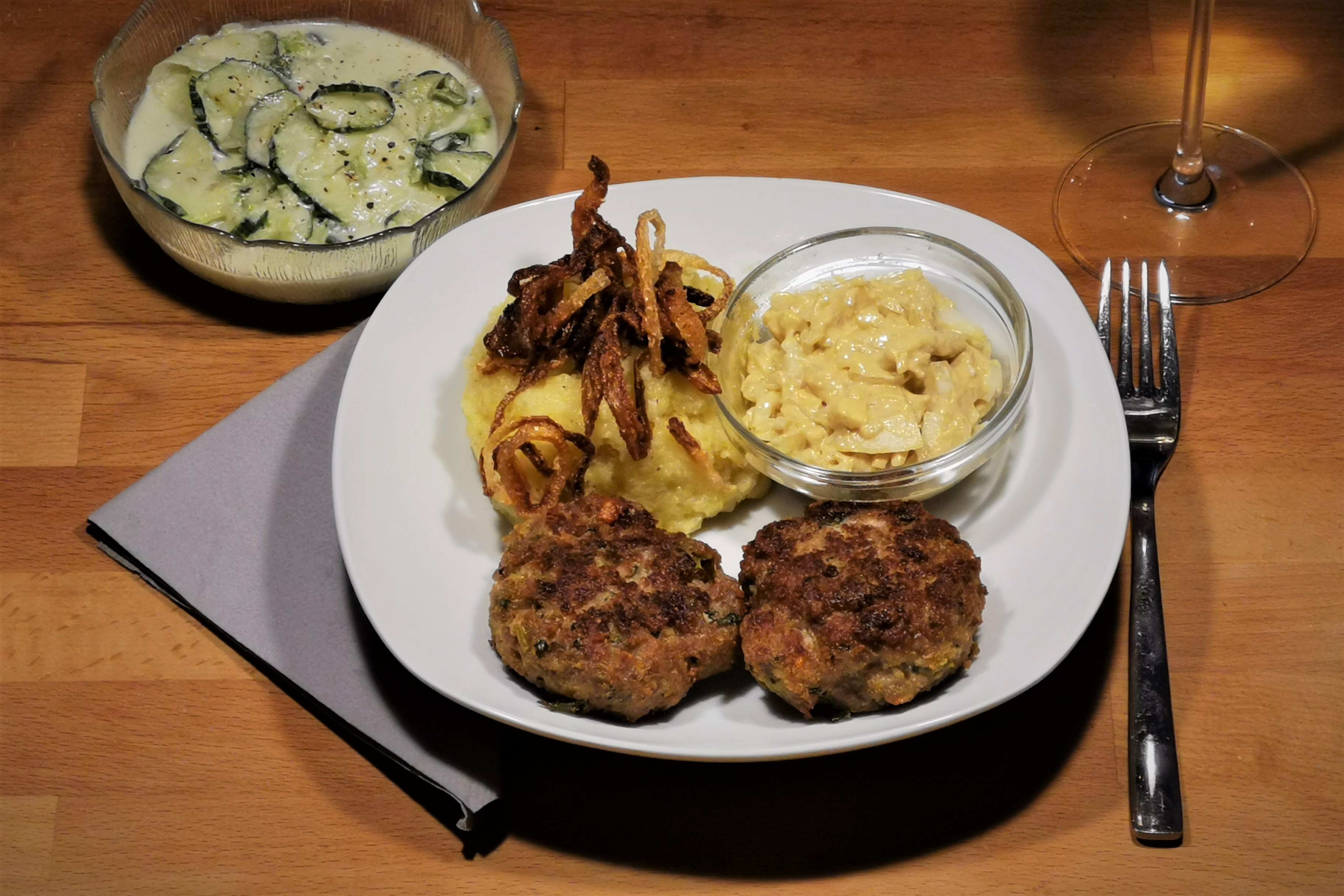 Während Püree, Röstzwiebel und mein Standard-Sommer-Gurken-Rahm-Salat schon Routine sind und auch stets gut gelingen, arbeite ich immer noch an der Fleischmasse. Ich finde immer noch nicht die rechte Zusammensetzung. Tja, und das schmeckt man dann auch. ;) Dazu könnte ich Tipps gebrauchen.