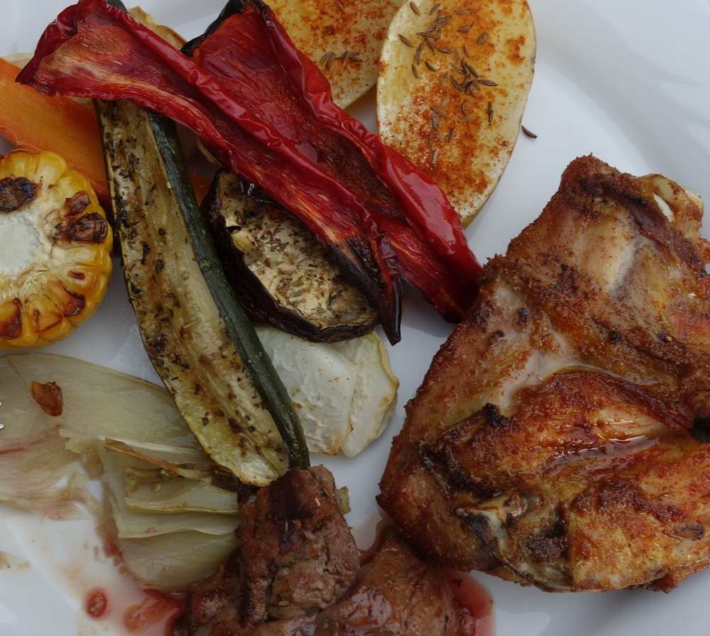 Ganz viel Gemüse vom Grill: Maiskolben, Kohlrabi, Fenchel, Karotten, Knollensellerie, Zuchetti, Auberginen, Peperoni. Als Beilage etwas Kartoffeln und ganz wenig Lamm, etwas Poulet und ein Stück Bratwurst.