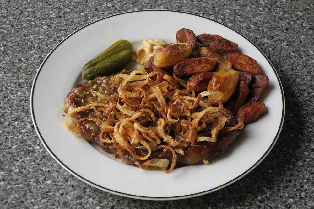 Fleisch und Saft waren Klasse, die Röstzwiebel sogar delikat. Wo ich noch Nachschulung benötige sind die Bratkartoffel. Ja, die waren ... wieder einmal ... zu fest gebraten und damit zu braun. Gegessen wurden sie trotzdem. :mrgreen: