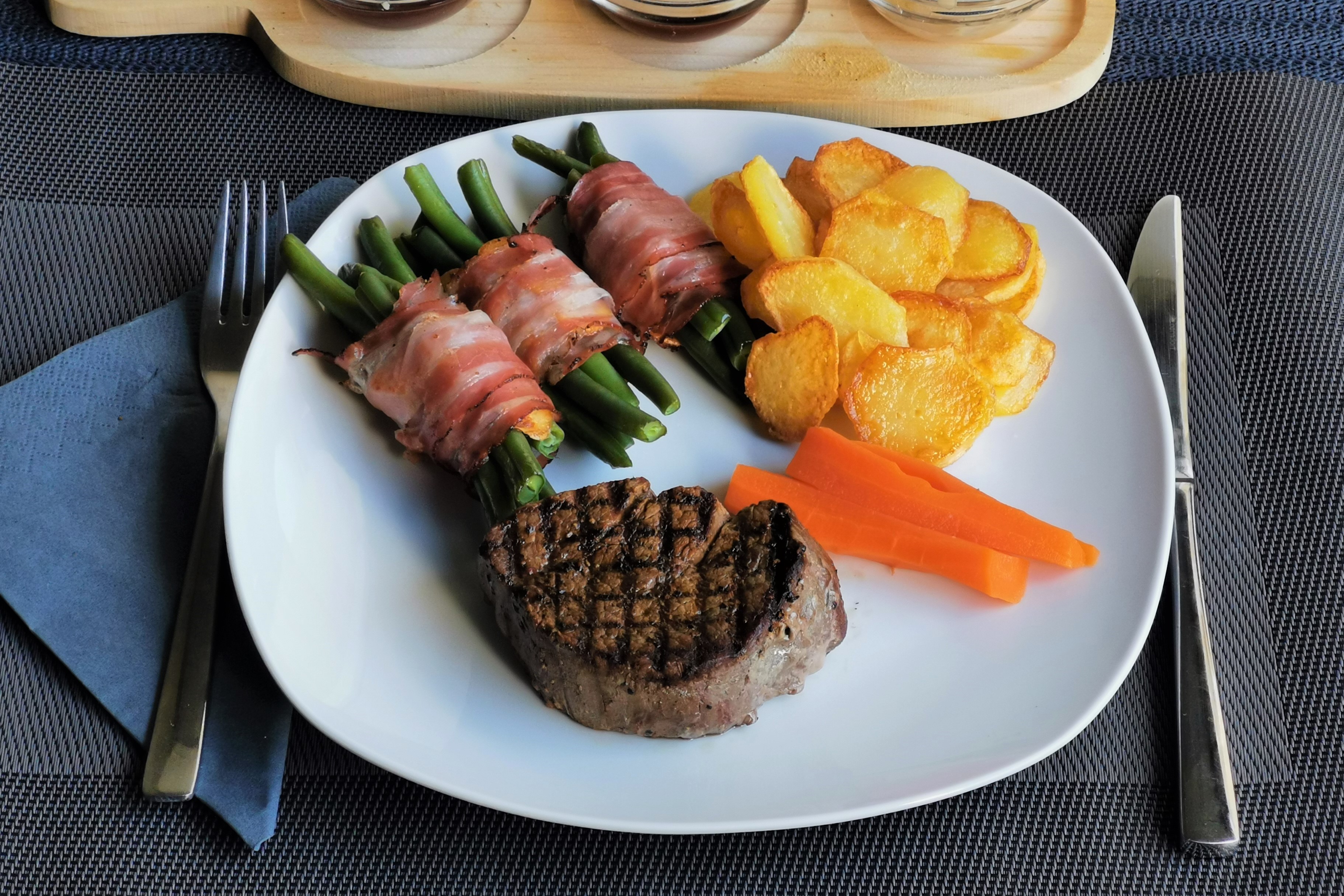 Dazu Fisolen im Speckmantel, ein paar Kartoffelchips und gedünstete Karotten. Ergänzend dazu ein paar Soßen, welche es nicht auf das Bild geschafft haben, aber für eine nabgerundeten Gesamtgeschmack gesorgt haben. Das Filet war Garstufe medium, so bevozugen es alle bei uns.