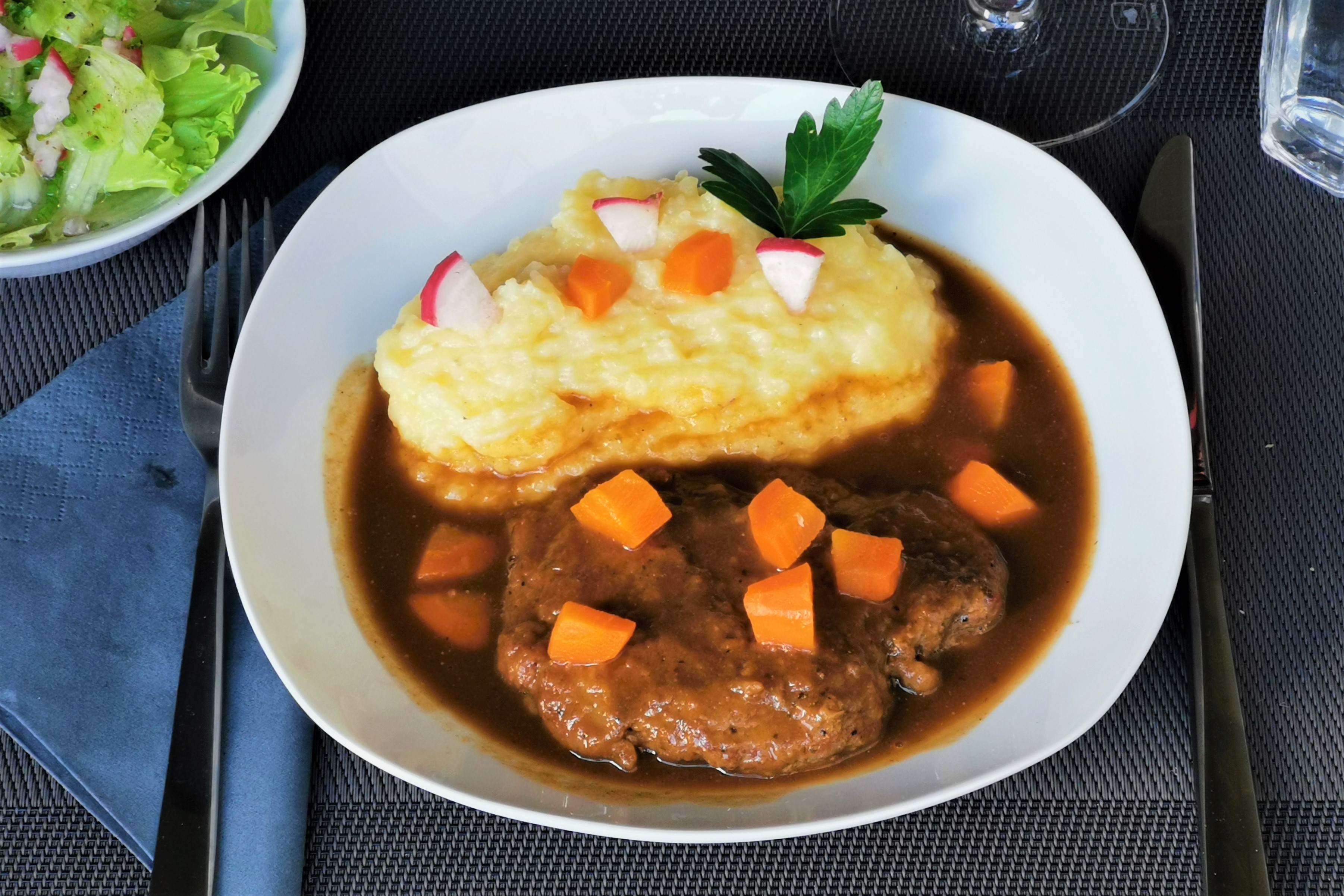 Mein Sonntagsmenü, eine Rindsbraten mit Erdäpfelpüree. Weil Sonntag ist/war wählte ich kein gewöhnliches Rindschnítzel-Fleisch sondern ich nahm einen schön abgelegten Rostbraten: