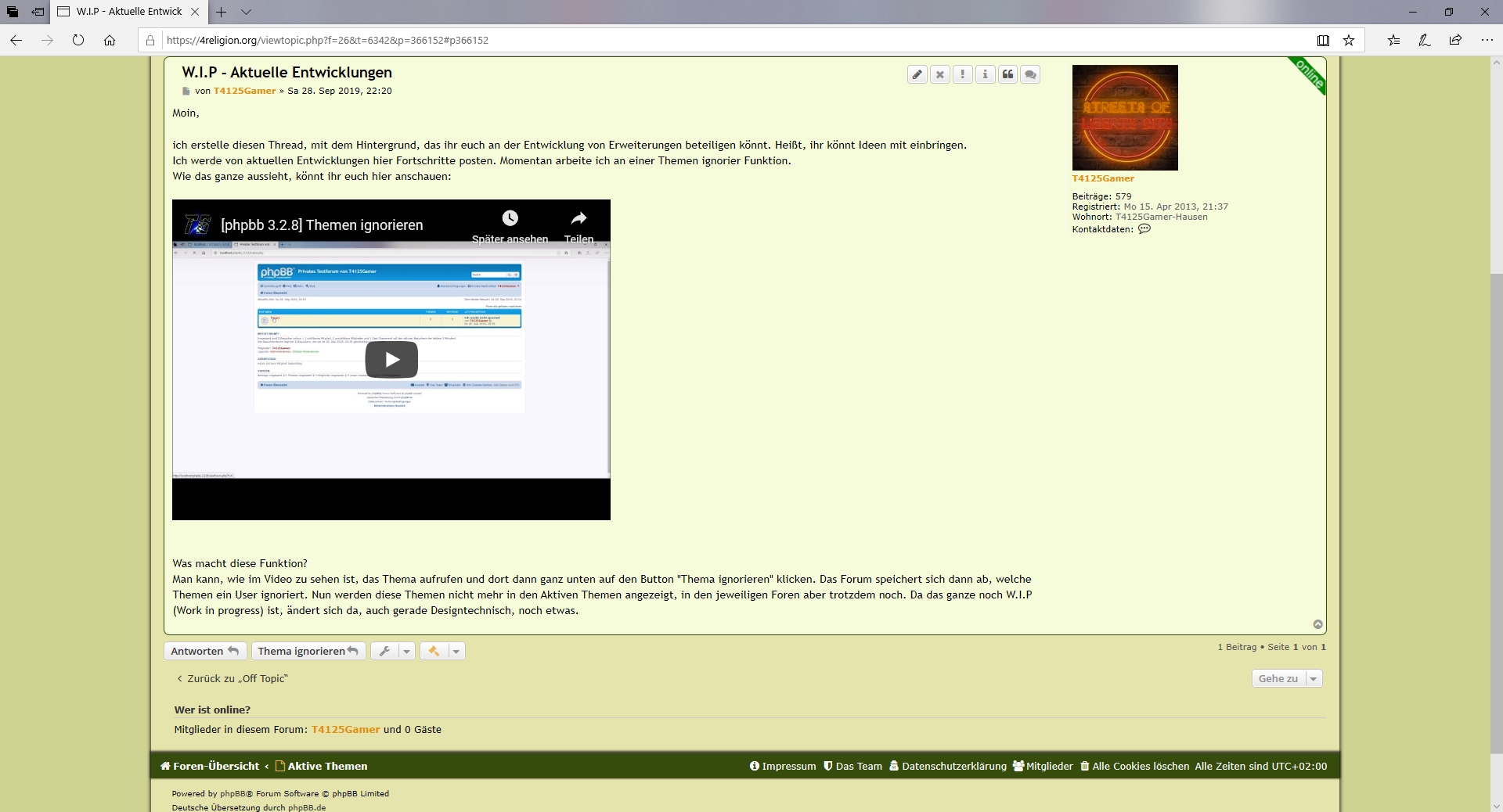 Es wurde mehrfach, nicht nur hier, angemerkt, dass einem irgendwelche Threads auf die Nerven gehen usw. Da ist mir die Idee gekommen, für diese User nach einer Erweiterung zu suchen, die Themen ausblendet, die man nicht lesen möchte. Da aber keine solche Erweiterung von irgendjemanden programmiert wurde (es gab da mal eine, die aber für eine sehr alte Version ist und auch nicht mehr zum Download zur Verfügung steht) habe ich mich an diese ganze Thematik rangesetzt. Meine Version ist so aufgebaut, dass die ignorierten Themen nicht mehr in den Aktiven Themen angezeigt werden. In den jeweiligen Foren aber trotzdem noch. Eventuell baue ich das noch etwas um, damit auch in den Foren diese Themen ausgeblendet werden. Dazu habe ich mal eine Umfrage gestartet.