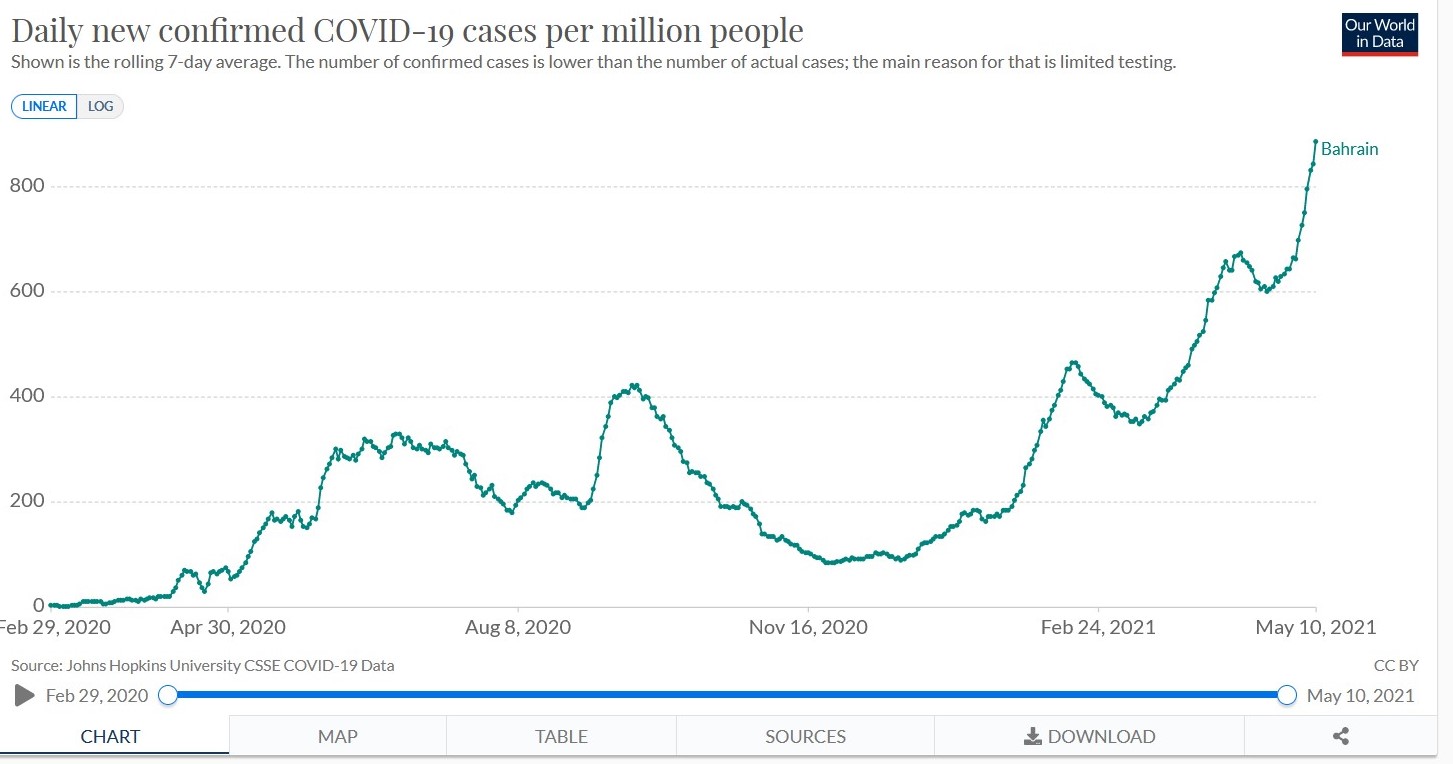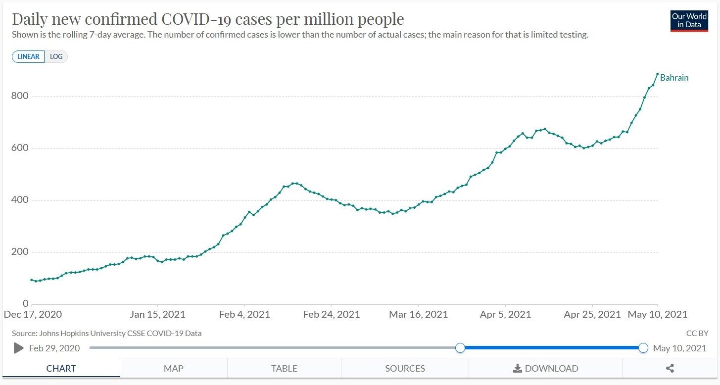Offenbar sterben in Bahrein nur sehr wenige Menschen an der Erkrankung. 691 Menschen auf 1,7 Millionen Einwohner. Das ist eigentlich nichts, was der Rede wert ist - was die reinen Zahlen betrifft natürlich.