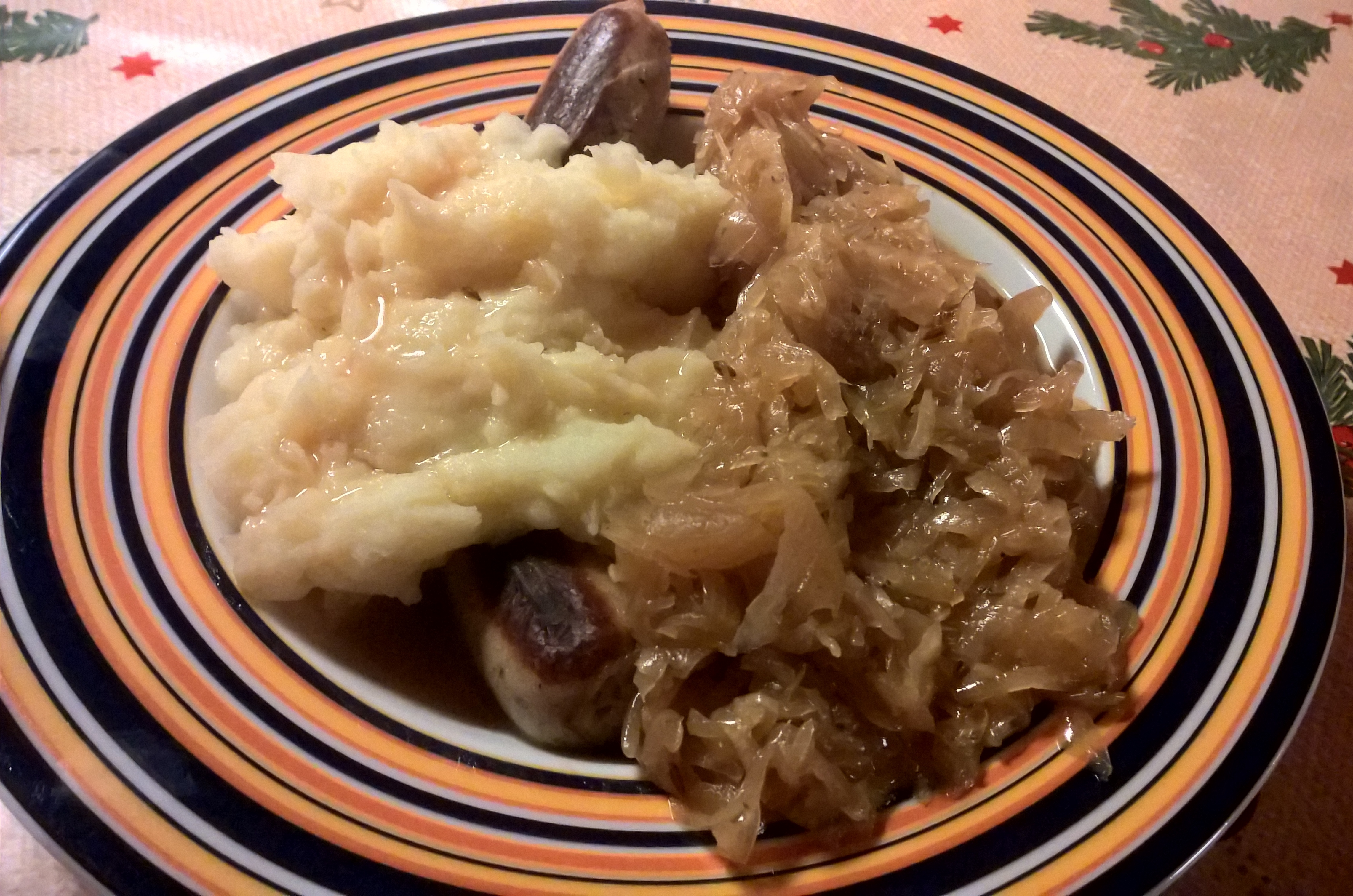 Sehr lecker. Kartoffelbrei mit Sauerkraut und Geflügelbratwurst.