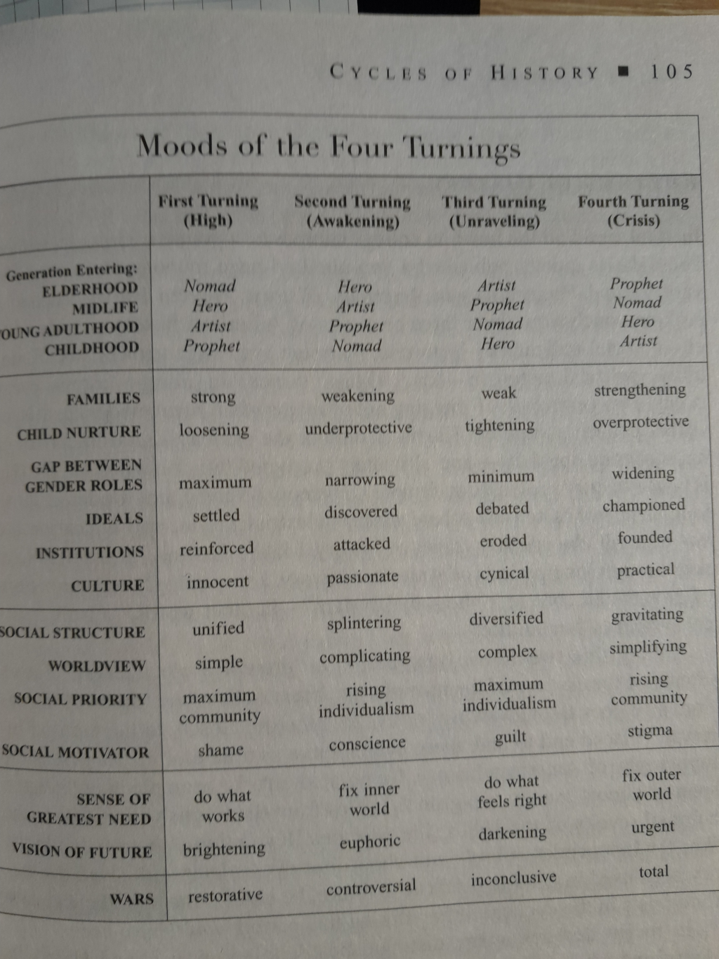 kann das Buch "The Fourth Turning" nur empfehlen, auch wenn es sich an der amerikanischen Geschichte orientiert. Zur Orientierung: wir dürften uns gerade in einer Zeit der Auflösung (unraveling) befinden, sofern wir nicht bereits in einer Krise stecken (wofür es sicher auch einige Argumente gäbe). So genau wird man das wohl erst rückblickend sagen können.